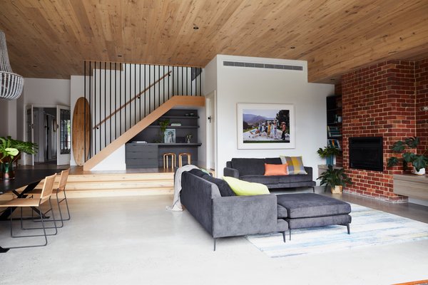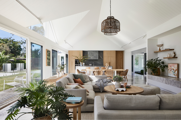 A light-soaked home on Victoria's Mornington Peninsula. It's easy to see why - indoors and outdoors flow seamlessly into one in these laid-back spaces. A calming confluence of light and air, lush greenery and welcoming wafts of Palm Springs modernism.