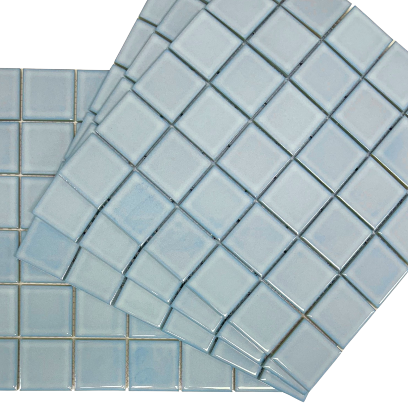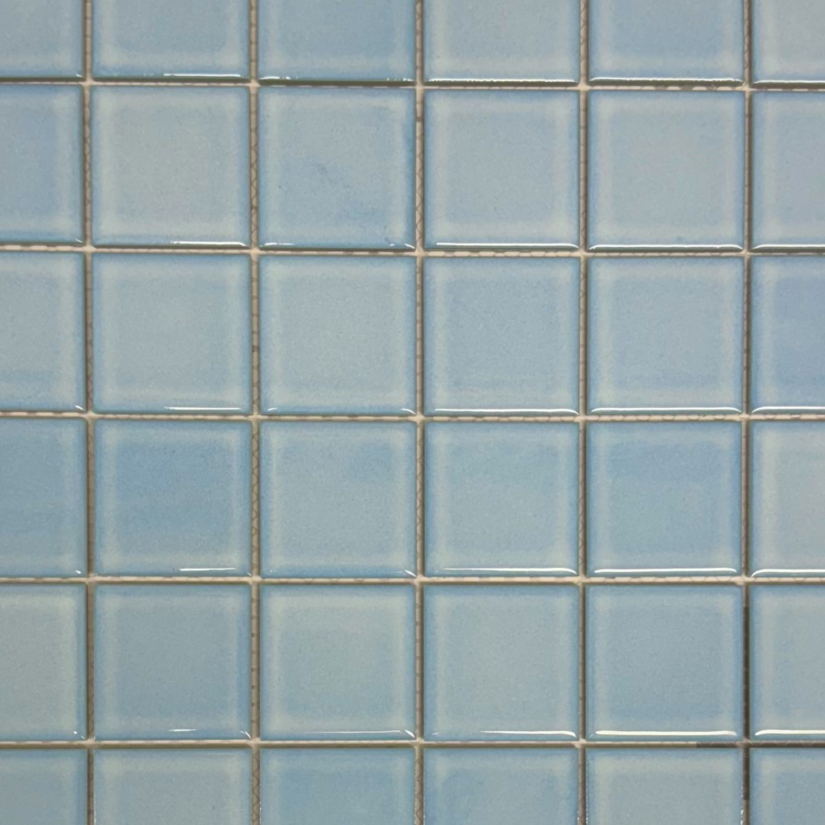 Inviting and cool, Aquamarine Blue is a light blue ceramic tile. Whether it is featured as a waterline tile, or for a fully tiled pool, this shade achieves a glacial, light blue water colour with a timeless appeal. Mosaic pool tiles bring elegance and luxury to any swimming area.